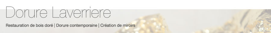 Dorure Laverriere Restauration de bois doré - Dorure contemporaine - Créations de miroirs 10 rue des Albères - 66 6690 Saint André tél : 06 63 02 55 88 e-mail : contact@dorure-laverriere.fr www.dorure-laverriere.fr - www.french-mirrors.com - Plan du site Siret n° : 795 370 354 00014 - Code APE n° 3109B délivré par la Chambre de métier et de l'artisanat de Perpignan